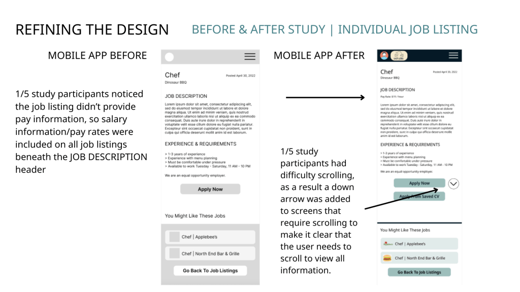 - 1/5 study participants noticed the job listing didn’t provide pay information, so salary information/pay rates were included on all job listings.