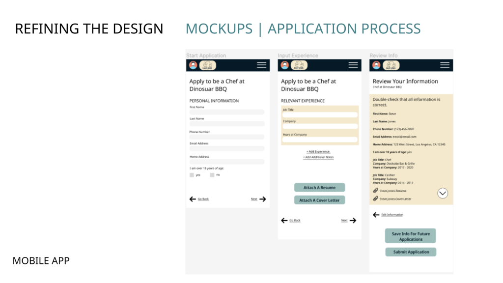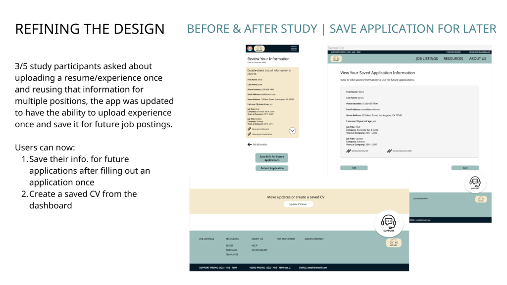 - 3/5 study participants asked about uploading a resume/experience once and reusing that information for multiple positions, the app was updated to have the ability to upload experience once and save it for future job postings.