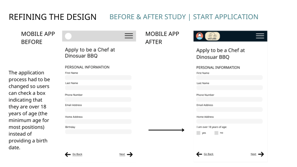 - 1/5 study participants felt uncomfortable providing a birth date, as a result the application process had to be changed so users can check a box indicating that they are over 18 years of age (the minimum age for most positions) to avoid agism.