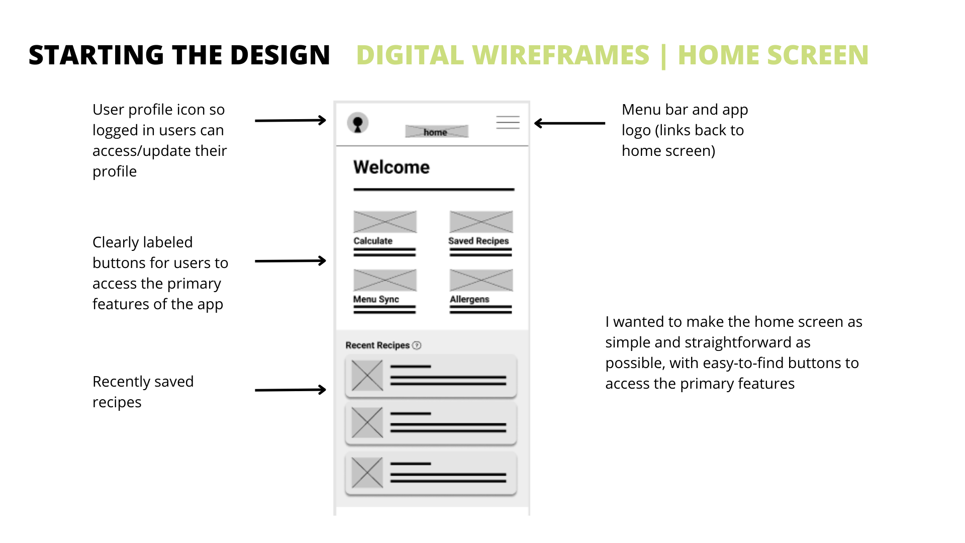 To start, I wanted to outline the home screen to ensure that all the primary features I wanted to include in the app were available from that screen.