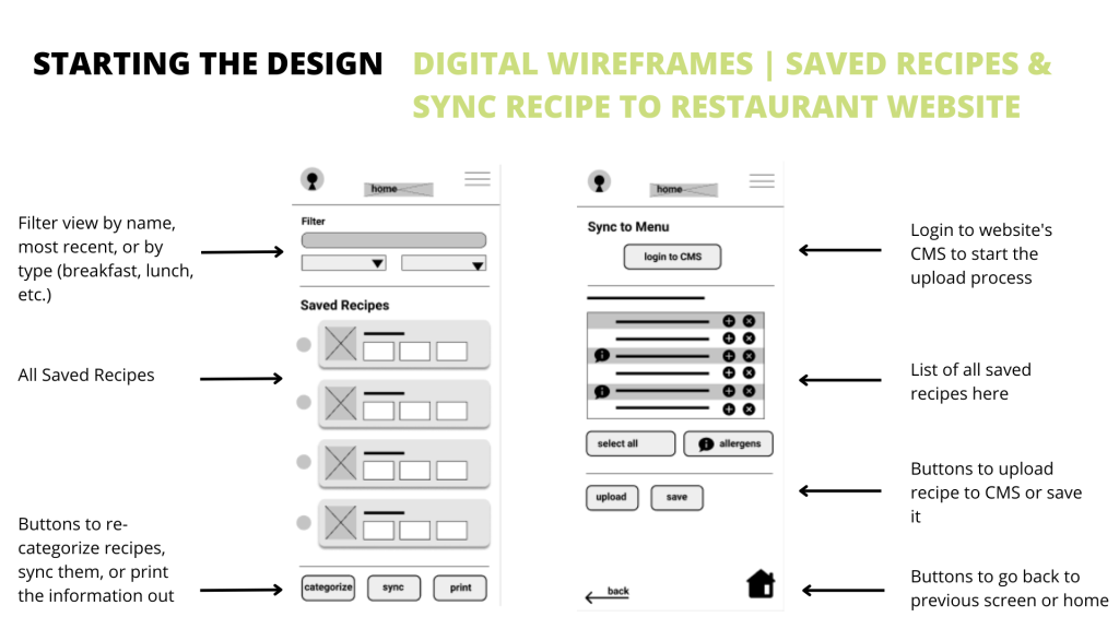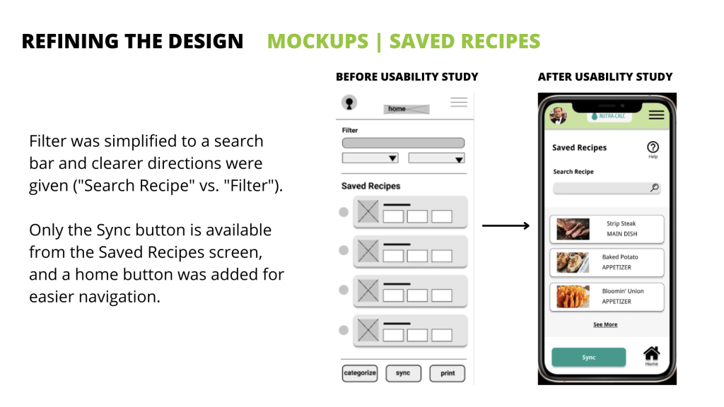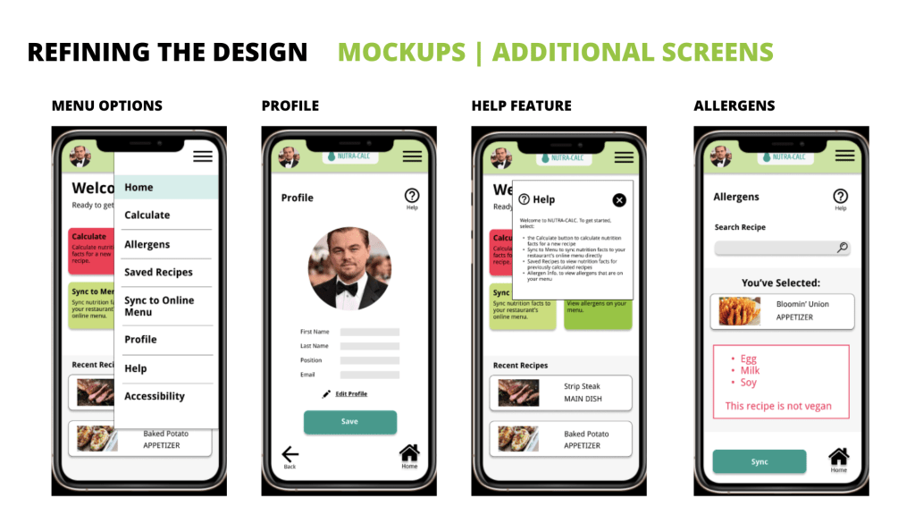From this user journey map, the ability to save nutrition information, search for common ingredients from a dropdown, and sync nutrition info. with a restaurant’s menu were incorporated into the design.